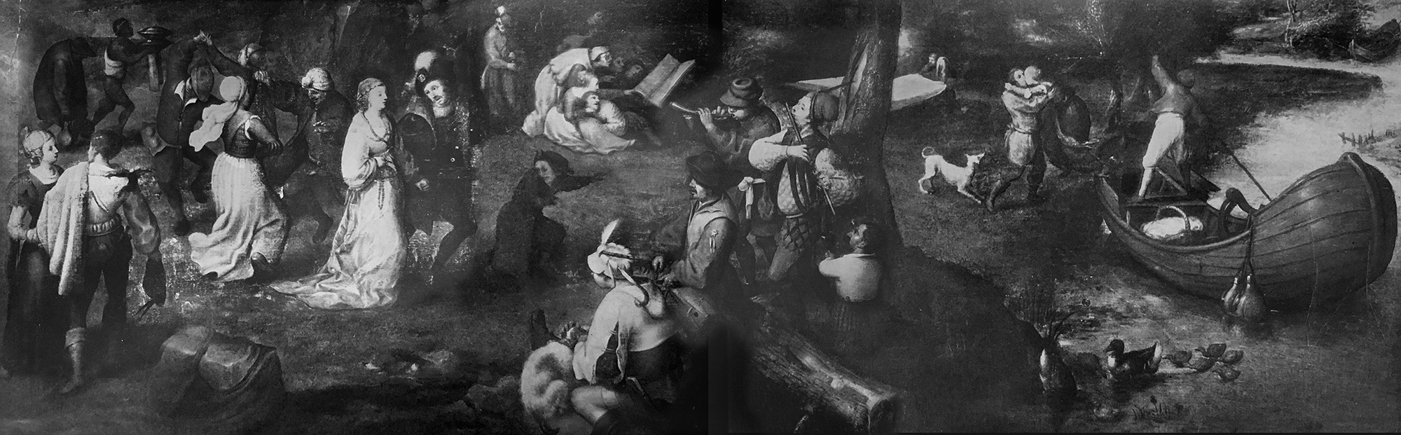 “Der Magdalenentanz” ist die Bezeichnung des Sujets (die Aram in Erinnerung war), der genaue Titel im “Pantheon” ist jedoch “Die Weltfreuden der Maria Magdalena”. Winkler vermutet, Brueghel habe sich in dem Zwerg der Musikergruppe selbst portraitiert.