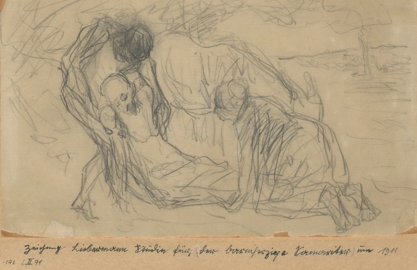 oben: Zeichnung von Max Liebermann, der barmherzige Samariter. Ein Werk mit diesem Titel findet sich in der Sammlungsliste Bensinger.