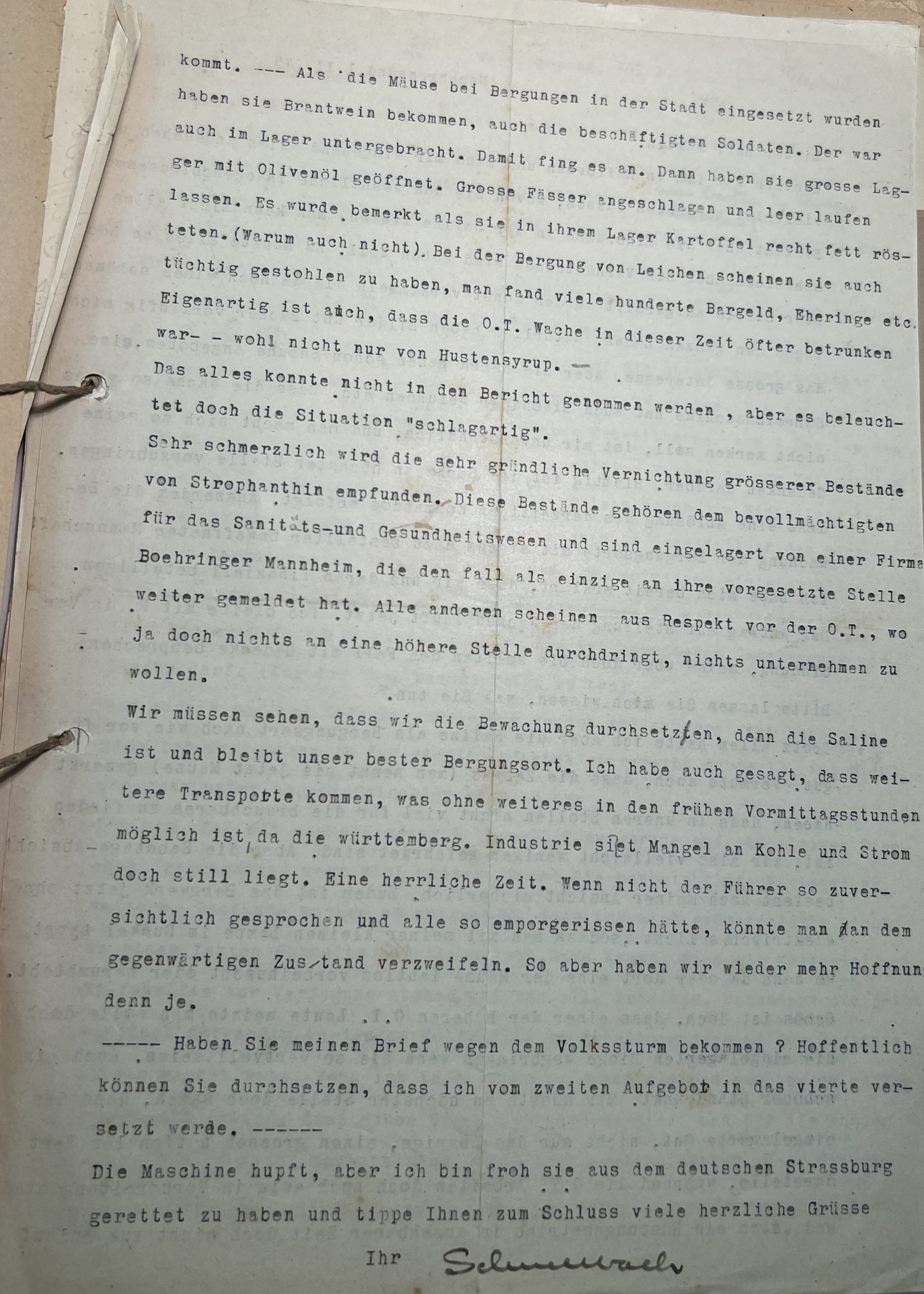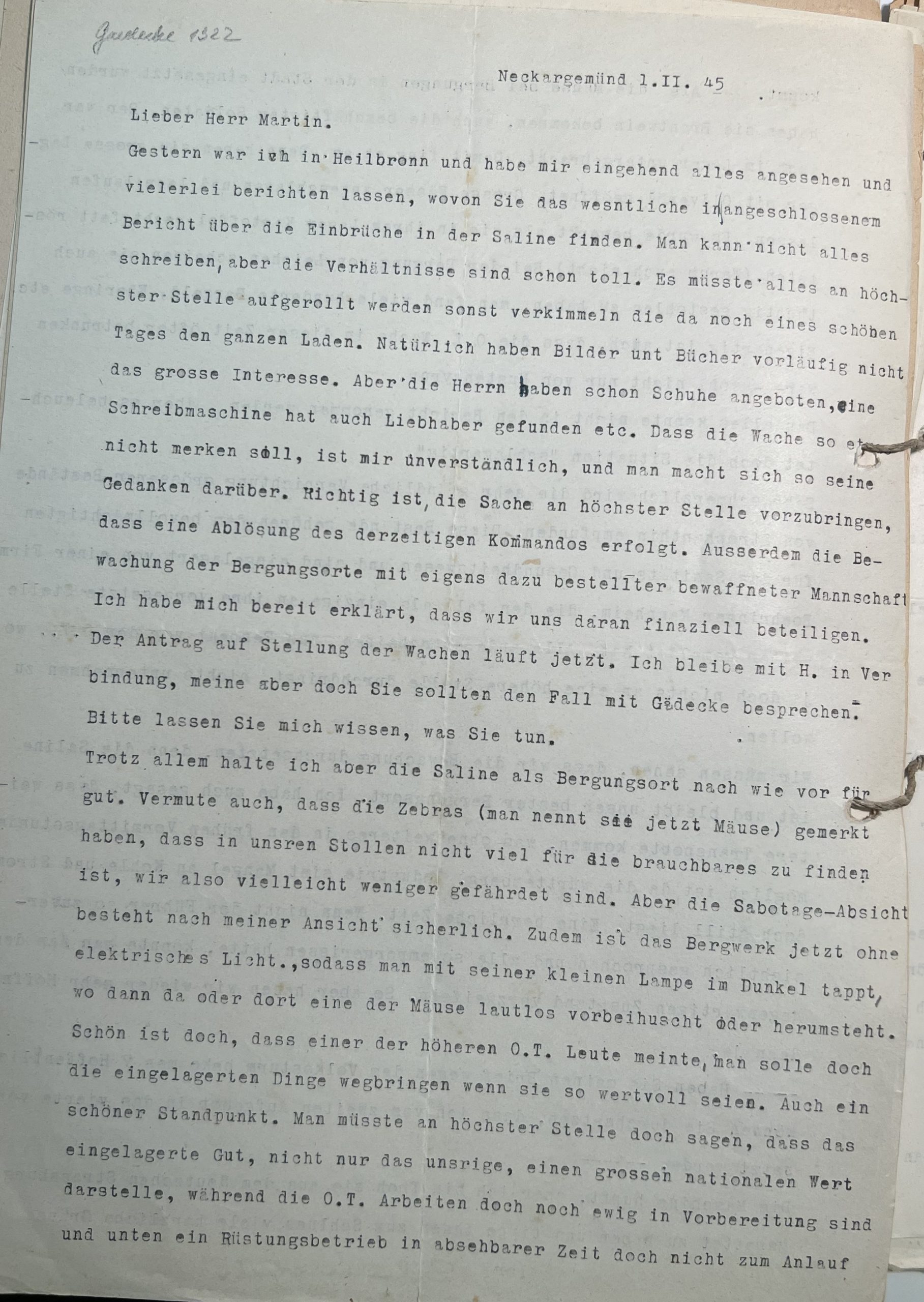 Kurt Martin beklagt sich nochmals, die KZ-Häftlinge im Salzbergwerk Heilbronn würden zu freundlich behandelt (wörtlich verwendet er eine doppelte Verneinung um die Klage vorzubringen, die Wachen würden die Diebstähle und Schäden fördern, indem die Häftlinge leider “nicht unfreundlich” behandeln würden).