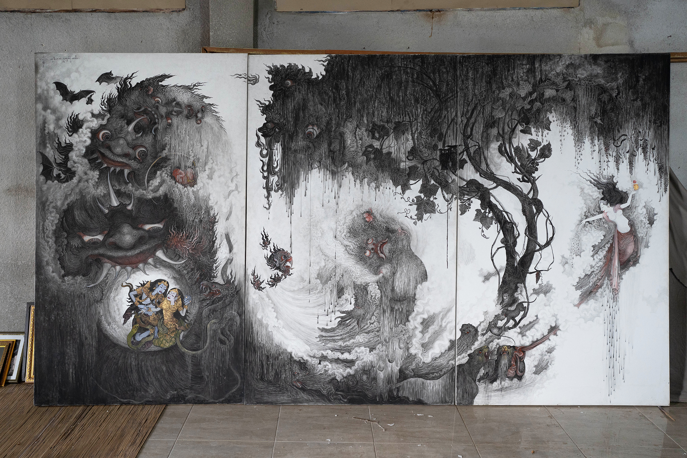 But painting is different. With painting, there are works that I keep for memory, and there are those that are sold. The process is different from making statues, like at Monkey Forest—all the works I did there were offerings. And also in Lombok, I made many statues as offerings. In Java too.