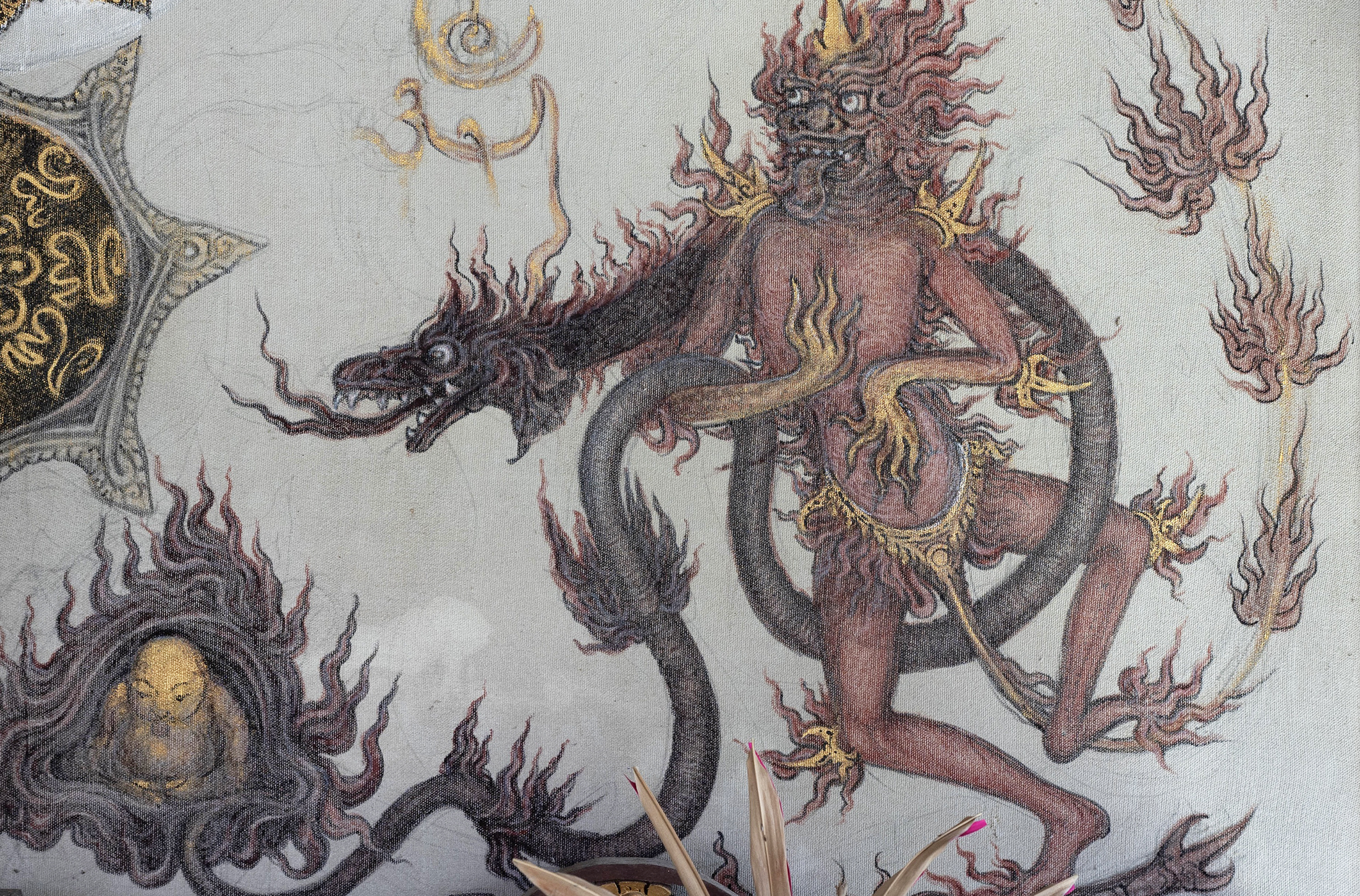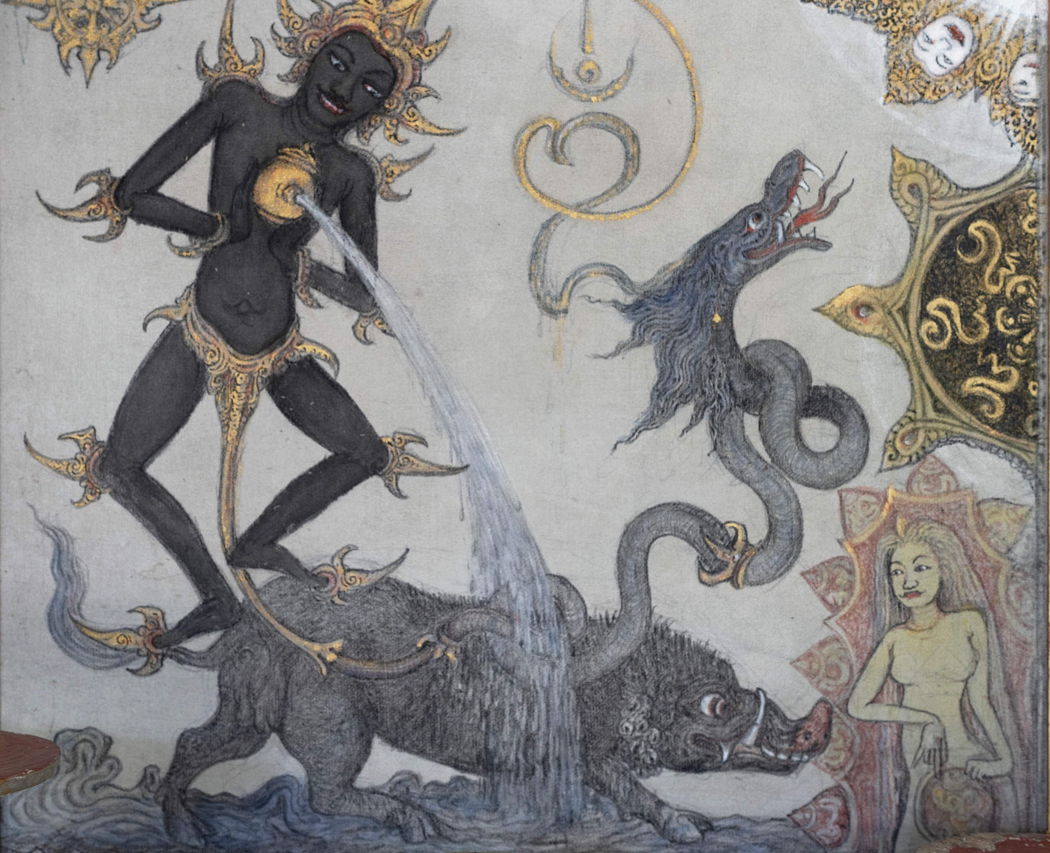 Budiana: So here I painted Brahma and Vishnu…..it’s the old the story of arrogance: “I am more powerful.” But not Brahma and Vishnu. So Brahma said he could reach the very top. And Vishnu said he could reach the very bottom. But then Shiva tested them. And what happened? Vishnu turned into a boar, he became a boar to go deeper and deeper, but he never found the end. Brahma turned into a bird, flying upward, but he never found the end either. It’s a wonderful story.